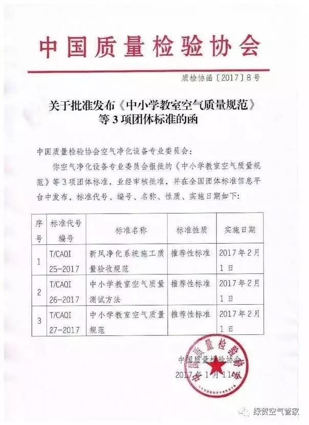 近日,由中國(guó)教育裝備協(xié)會(huì)提出,并由中國(guó)質(zhì)量檢驗(yàn)協(xié)會(huì)歸口,T/CAQI 27-2017《中小學(xué)教室空氣質(zhì)量規(guī)范》正式批準(zhǔn)發(fā)布。T/CAQI 27-2017《中小學(xué)教室空氣質(zhì)量規(guī)范》是一項(xiàng)綜合性標(biāo)準(zhǔn),標(biāo)準(zhǔn)主要針對(duì)幼兒園、中小學(xué)應(yīng)對(duì)霧霾、室內(nèi)污染如臭氧、氨、甲醛、總揮發(fā)性有機(jī)物等參數(shù)做出了明確的規(guī)定,為學(xué)生提供一個(gè)良好的學(xué)習(xí)環(huán)境。